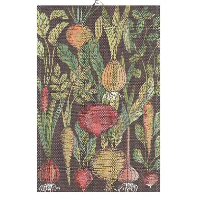 Rotfrukt håndkle fra Ekelund gir kjøkkenet et friskt og fargerikt preg med sitt detaljerte mønster av ulike rotfrukter. Dette håndkleet måler 40×60 cm og er ideelt til bruk på kjøkkenet, som gjestehåndkle eller som en dekorativ detalj på bordet. Det lekne designet passer perfekt i både moderne og klassiske kjøkkenmiljøer.