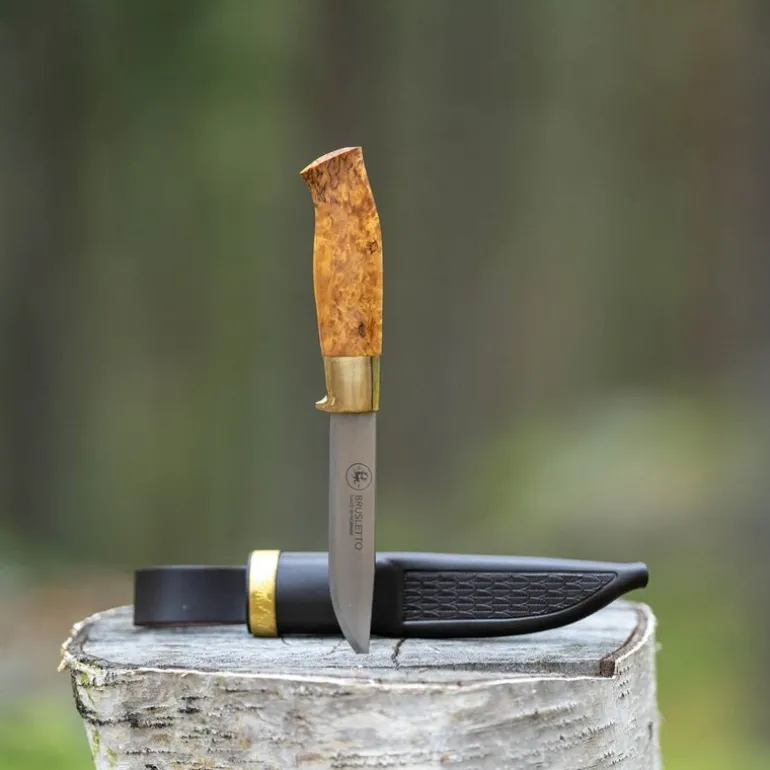 Hver kniv er håndlaget på Geilo, med oljet flammebjørkskaft og holk i massiv messing. Den medfølgende sliren i lær er dekorert med gravert messingbånd og leveres i flott gaveeske.