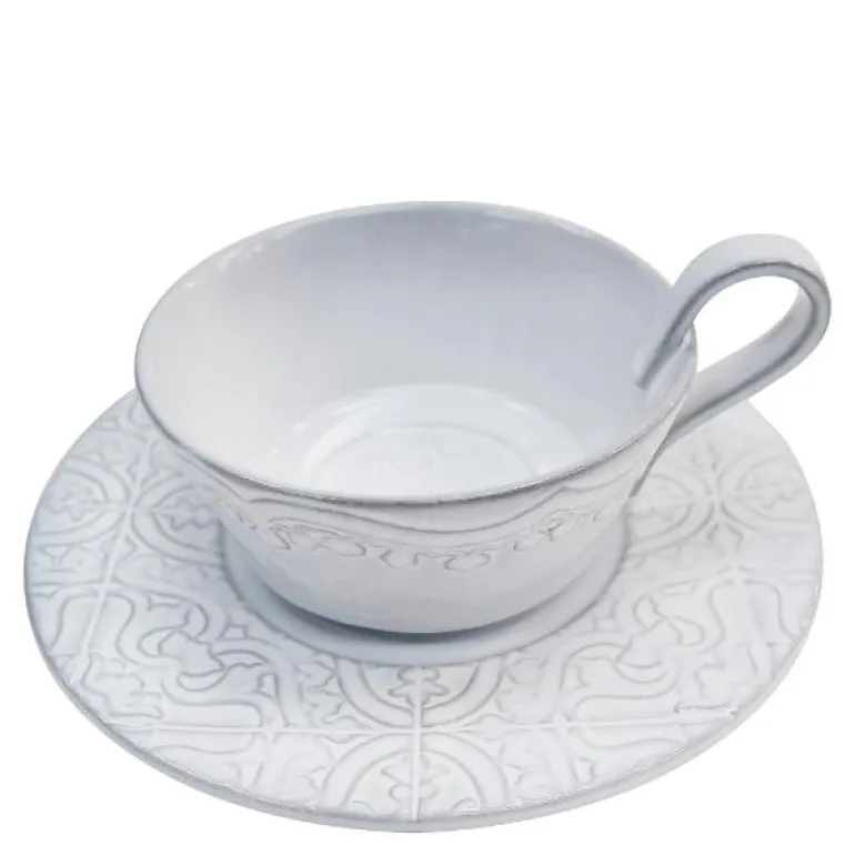 Rua Nova tekopp med fat 20 cl antikkhvit. Vakker tekopp med tilhørende fat i Rua Nova serviset fra Bordallo Pinheiro. Kombinasjonen av koppen og fatet skaper et herlig mønster. Passer til alle slags anledninger, både til hverdag og til fest. Rua Nova Tekopp med fat er laget i leirgods og rommer 20 cl.
