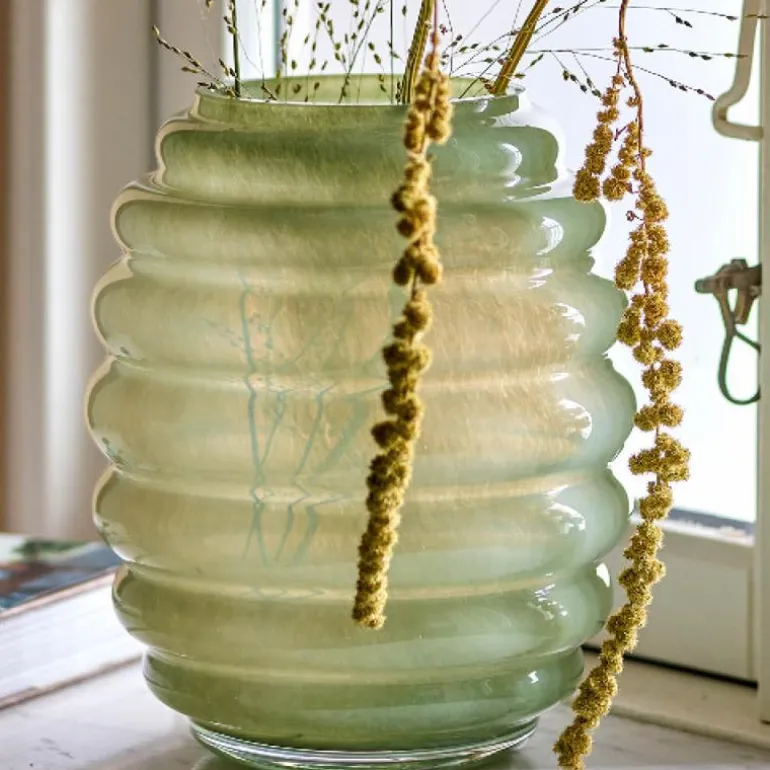 Saihah vase 24 cm grønn fra Bloomingville er laget av glass i en vakker nyanse av grønt. Vasen er munnblåst og derfor kan små variasjoner i størrelse, form og farge forekomme – dette bidrar bare til å gjøre hver vase unik.