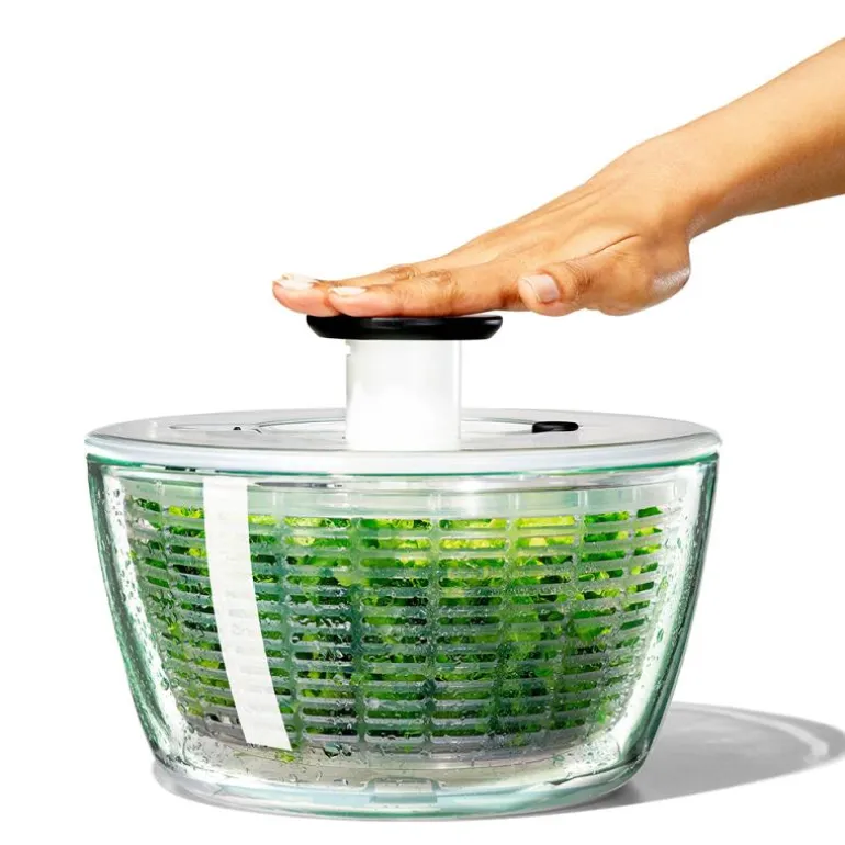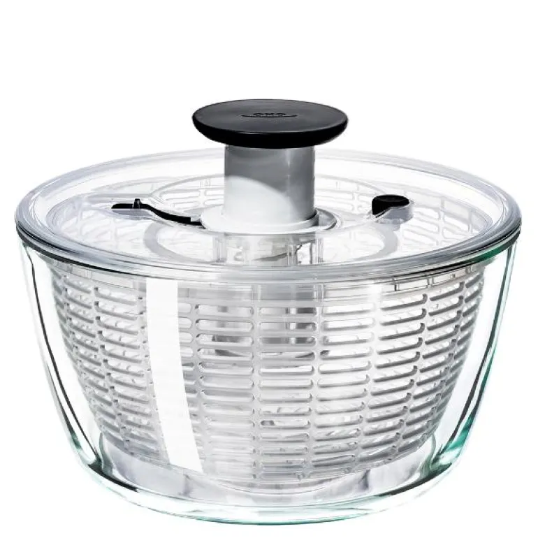 Stor salatslynge i moderne design, med skål i slitesterkt borosilikatglass. Utformingen i glass gjør denne salatslyngen til et eksklusivt og bæredyktig valg. Slyngen settes i gang med et lett trykk på pumpeknappen på toppen og stoppes ved å trykke på bremseknappen ved siden av. Spinnekurven fungerer som et dørslag, så du enkelt kan skylle salaten før du slynger den. Salatslyngen er også velegnet til å oppbevare salat i kjøleskapet og skålen er samtidig en elegant serveringsskål.