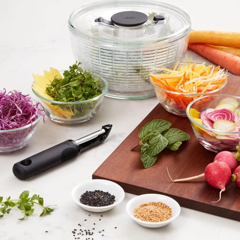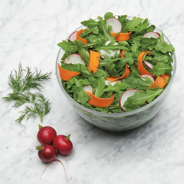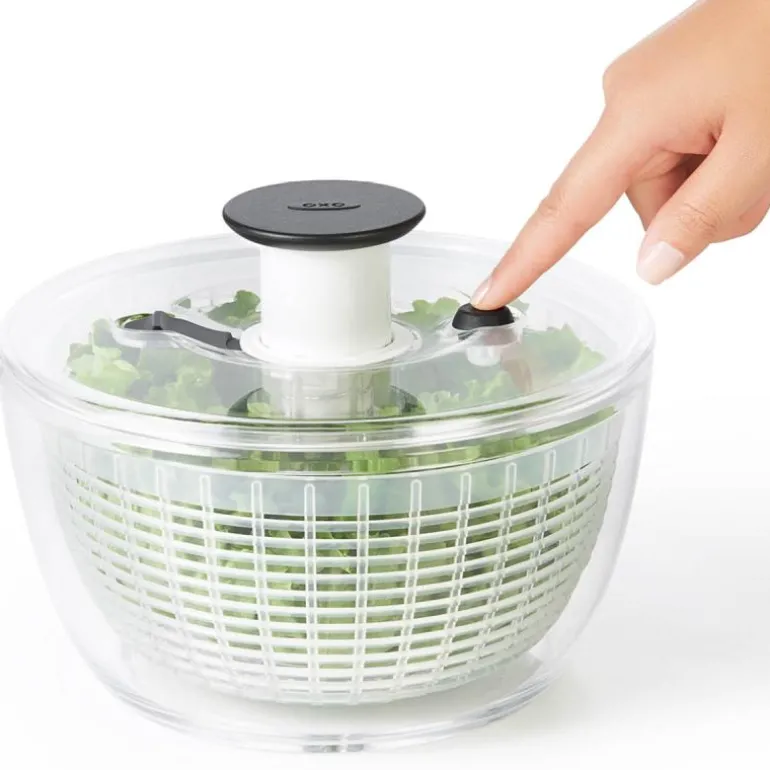 Slyngen settes i gang med et lett trykk på pumpeknappen på toppen og stoppes ved å trykke på bremseknappen ved siden av. En gummiring på undersiden sikrer at den står helt fast på kjøkkenbenken mens den er i bruk. Salatslyngen er også velegnet til å oppbevare salat i kjøleskapet og skålen er samtidig en elegant serveringsskål. Den lille salatslyngen er god til mindre porsjoner og til å skylle og slynge spinat, bær osv.