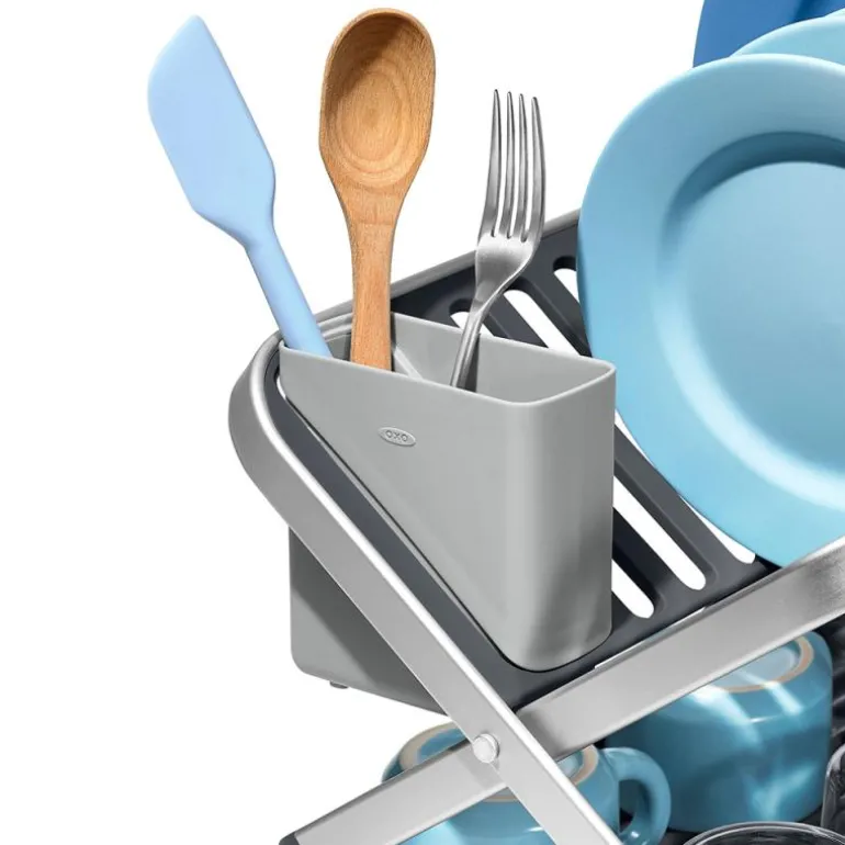 Elegant tørkestativ til oppvasken med rustfritt aluminium på sidene. Stativet har plass til tallerkener, skåler, glass, kopper, gryter, mm. Det medfølger en særlig holder til bestikk, som kan monteres på stativet. Stativet kan foldes helt flatt for kompakt oppbevaring. Bunnen kan rengjøres i oppvaskmaskinen.