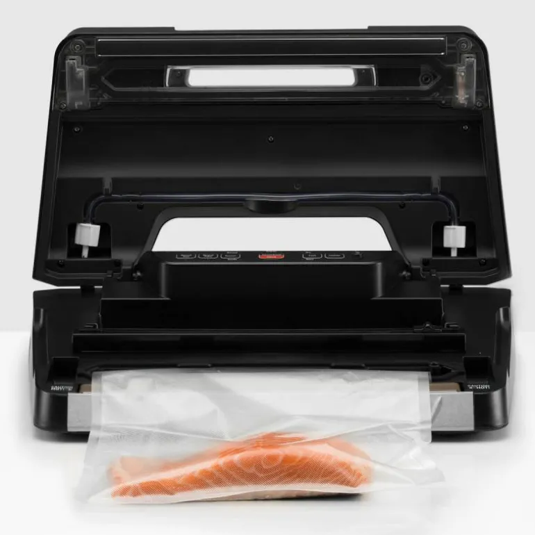 Hold maten fersk opp til 5 ganger lenger! Med vakuumpakkeren Season Pro forlenger du ikke bare holdbarheten på maten, men du sparer også plass i kjøleskapet og fryseren. Den er også perfekt til marinering av kjøtt, fisk og fjærkre. Ved hjelp av den manuelle vakuumeringsfunksjonen, samt innstillingene for tørre og fuktige matvarer, kan du vakuumpakke en rekke forskjellige råvarer, som kjøtt, fisk, frukt, sopp, grønnsaker og tørrvarer. Season Pro er også bygget for kontinuerlig drift på opptil 100 forseglingssykluser, uten pause – ideelt for jegeren! Integrert posekniv og -lagring gjør makinen enkel å bruke og praktisk å oppbevare. Praktisk poselagring og integrert posekutter følger med. Inkludert i startpakke: 1 stor rull (3 m x 28 cm) og 5 store poser (28 x 40 cm).