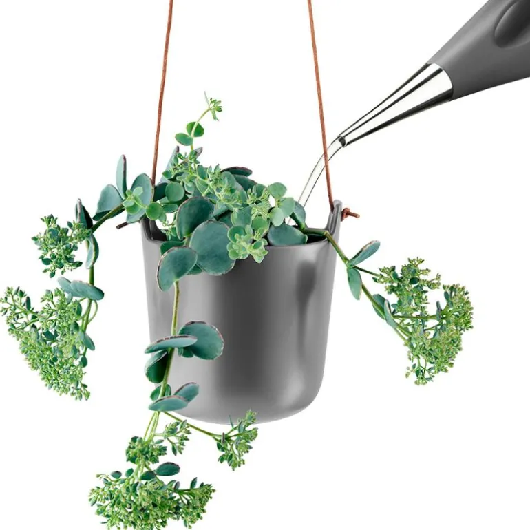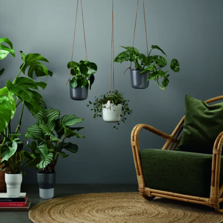 Selvvannende og dekorative urtepotter i matt steintøy og med skinnsnor til oppheng. En organisk design som med urtepottens selvvannende system gir optimale vekstbetingelser for krydderurter og blomster. Nylonveker i bunnen av den øverste potten og en vannbeholder i den nederste potten gjør at planten selv kan suge til seg riktig mengde vann. Planteinnsatsen i plast er utstyrt med en åpning som gjør det lett å fylle på vann.