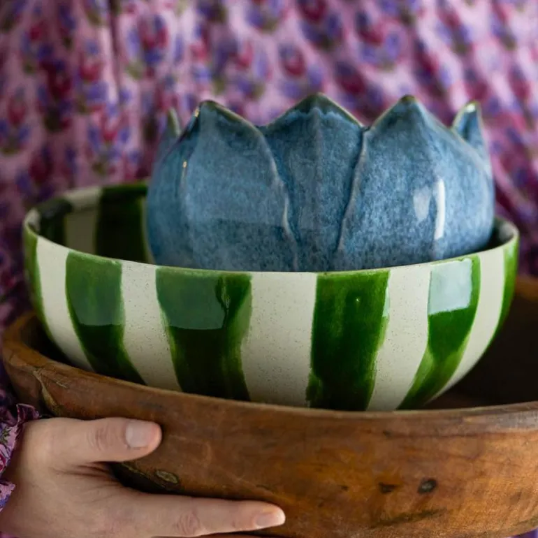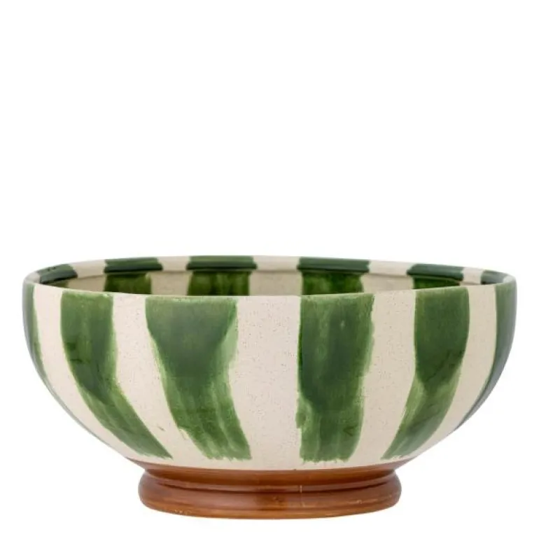 Shakti skål 26 cm grønn er laget av steintøy med et uformelt håndmalt grønt stripete mønster og en komplementær brun fot. Bruk fatet til å dekorere hjemmet ditt eller til å servere. Variasjoner kan forekomme, da hver tallerken er dekorert for hånd.