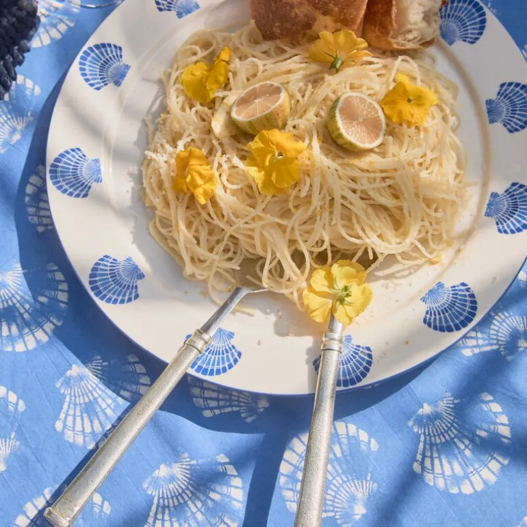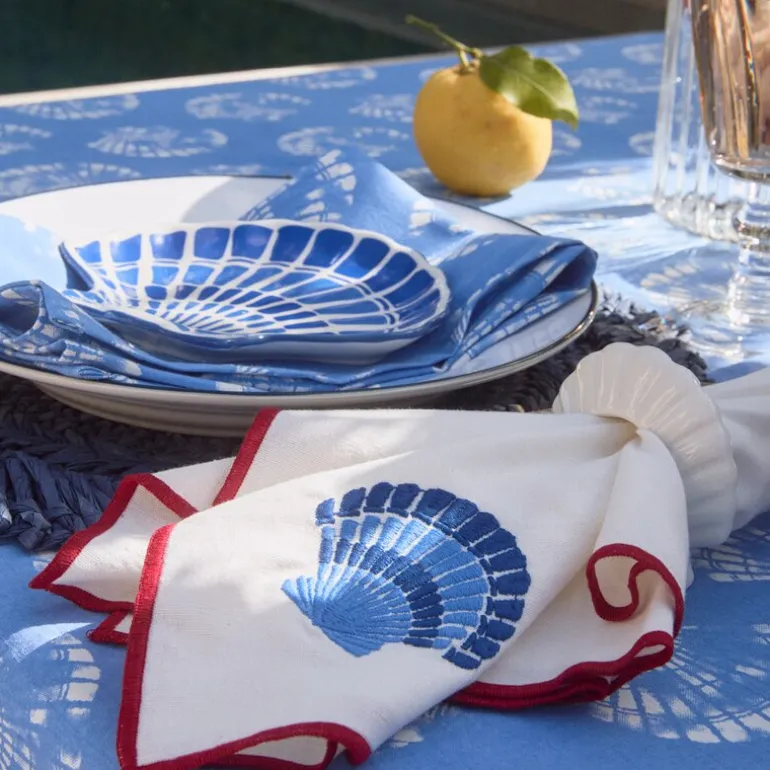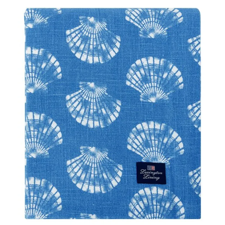 Lexingtons Shell bomullsduk i målene Ø180 cm kombinerer et elegant skjellmønster i blått og hvitt med et praktisk design som passer både inne og ute. Duken tilfører en sofistikert, kystnær følelse som løfter stemningen ved bordet.