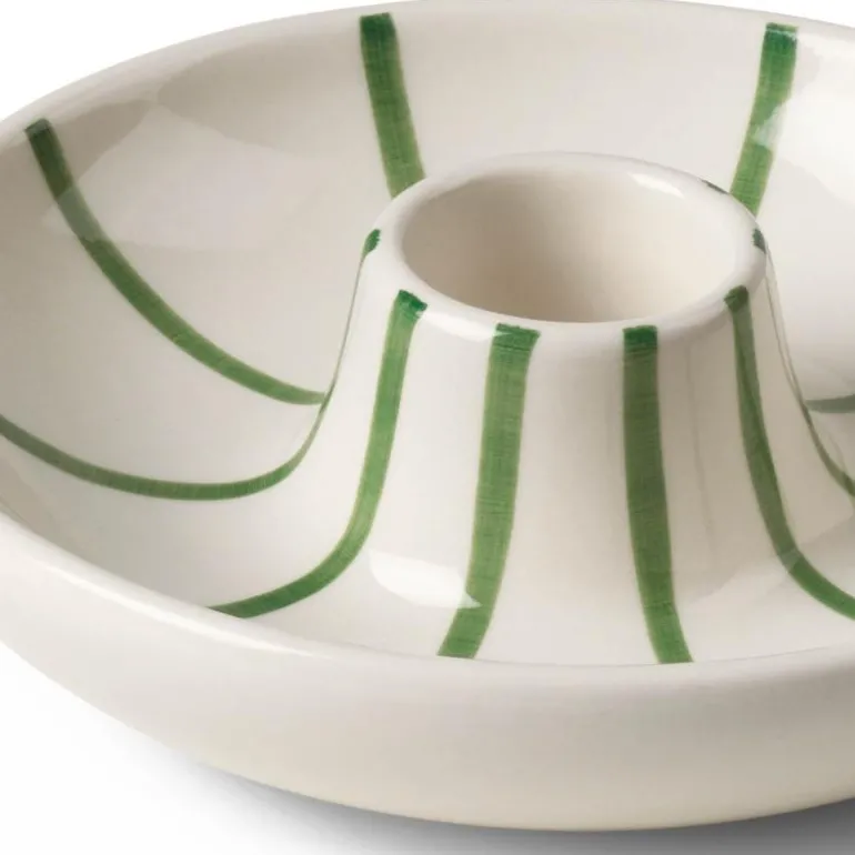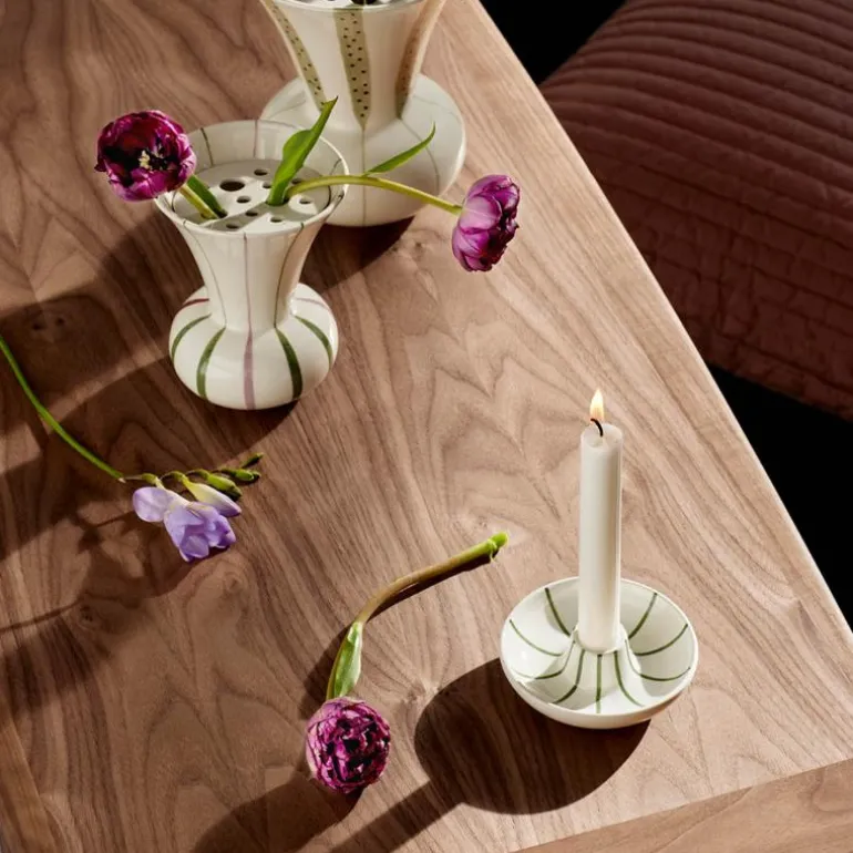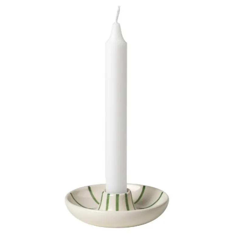 Med naturen som inspirasjonskilde har Meyer Lavigne skapt to vaser for Kähler med det lekende og subtile uttrykket som er designduoens signatur ? derav navnet Signature. Serien suppleres nå med en ny lysestake som er skapt i forlengelse av vasenes poesi, formspråk og motiver. Lysestaken i stentøy har et mykt og organisk uttrykk med den flotte symmetrien man kjenner fra blomster og blader. Innsiden av den lave staken er dekorert med håndmalte striper i en støvet grønn nyanse, mens lyset plasseres i midten og fullender designet. Staken passer til et vanlig kronelys, og med et farget, snodd eller ombre lys er det mulig å skape en helt personlig stil i boligen. I tråd med Kählers håndverksmessige designtradisjon er de grønne stripene malt for hånd, og har livet, dynamikken og autentisiteten i uttrykket som er så viktig for Meyer Lavigne å få frem.