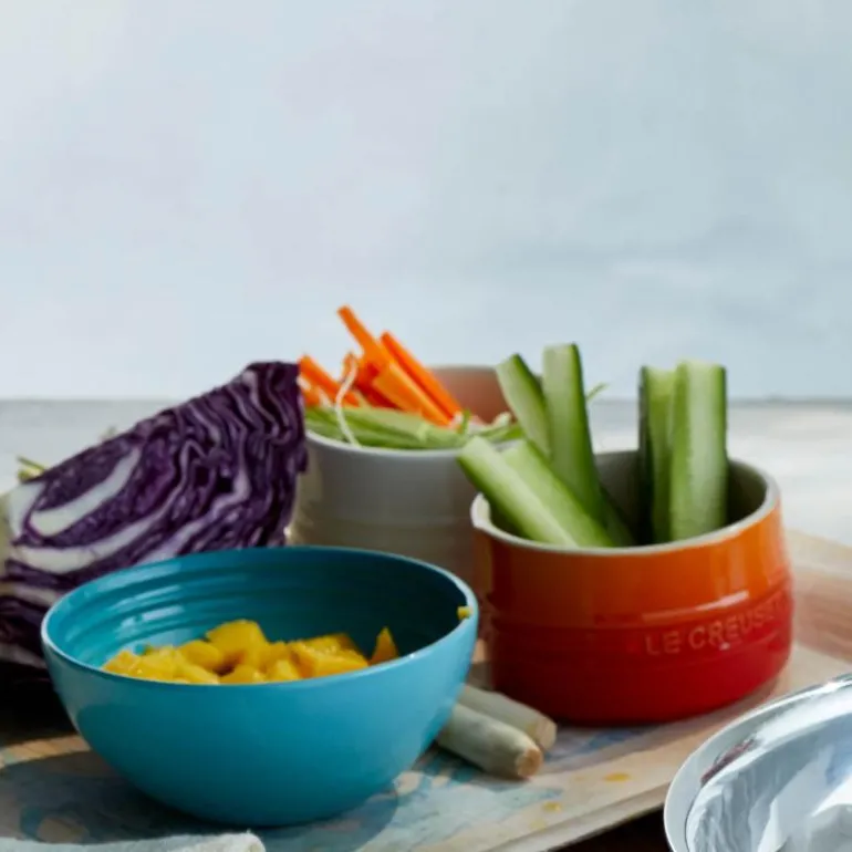 Snacks. Fingermat. Dipper. Server alle mulige godsaker i denne allsidige stentøyskålen. Den matcher serveringssettet til Le Creuset, så du kan bygge en egen kolleksjon. Du kan til og med legge den inni andre skåler. Det ikoniske designet med de tre ringene gir bordsetningen et unikt preg.