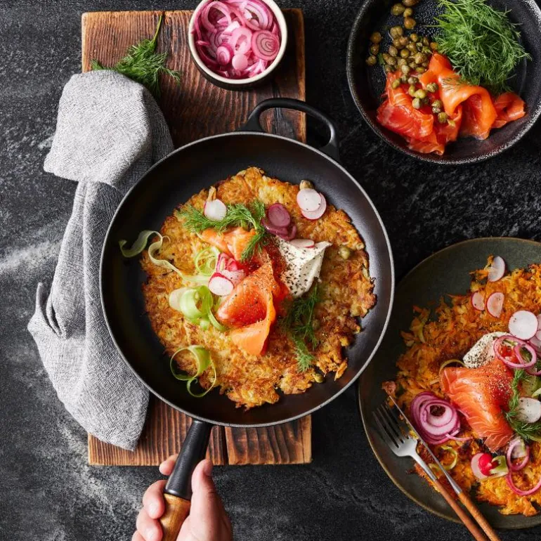 Denne støpejernspannen fordeler varmen jevnt og forsegler raskt utsiden av maten, noe som resulterer i bevaring av fuktighet, næringsstoffer og smaker for minneverdige retter. Det ergonomiske håndtaket gir et bedre grep, mens det kjølige trehåndtaket har blitt redesignet for bedre komfort. Pannen har også en integrert løkke for enkel opphenging.