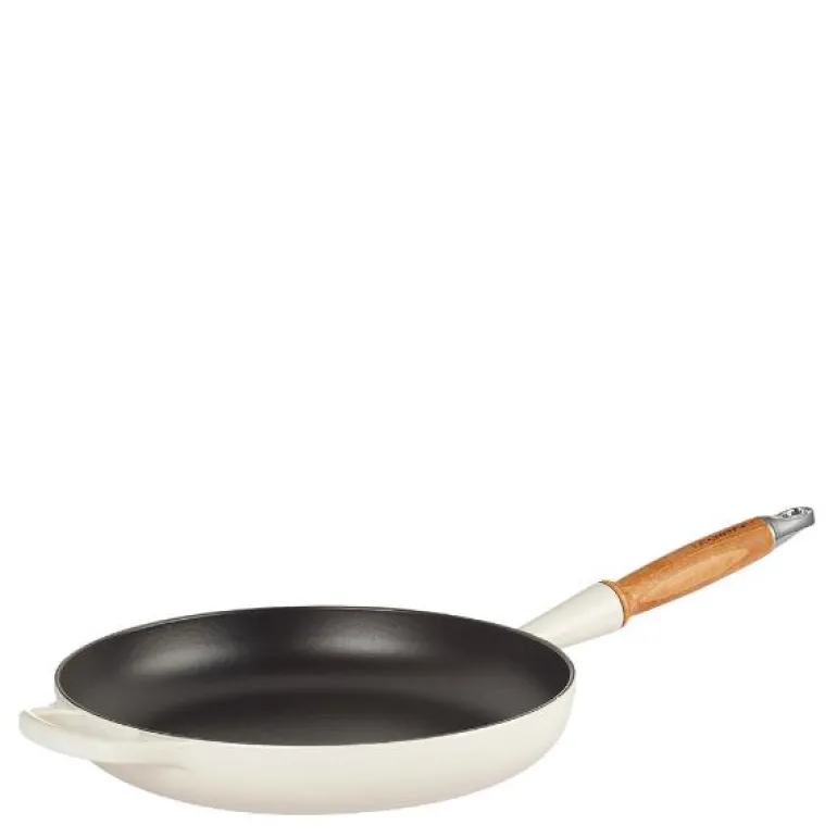 Stekepanne 28 cm i fargen meringue, med trehåndtak, fra Le Creuset. Stekepannen har et utall av anvendelsesmuligheter, blant annet steking av biffer og grønnsaker. Trehåndtaket blir ikke varmt ved matlaging, og pannen er derfor grei å håndtere uten bruk av grytekluter. Den innvendige sorte emaljen er spesielt fremstilt for matlaging som krever høye overflatetemperaturer. Støpejernspannen fås i et bredt utvalg av Le Creusets velkjente farger, slik at den matcher resten av samlingen og/eller kjøkkenet.