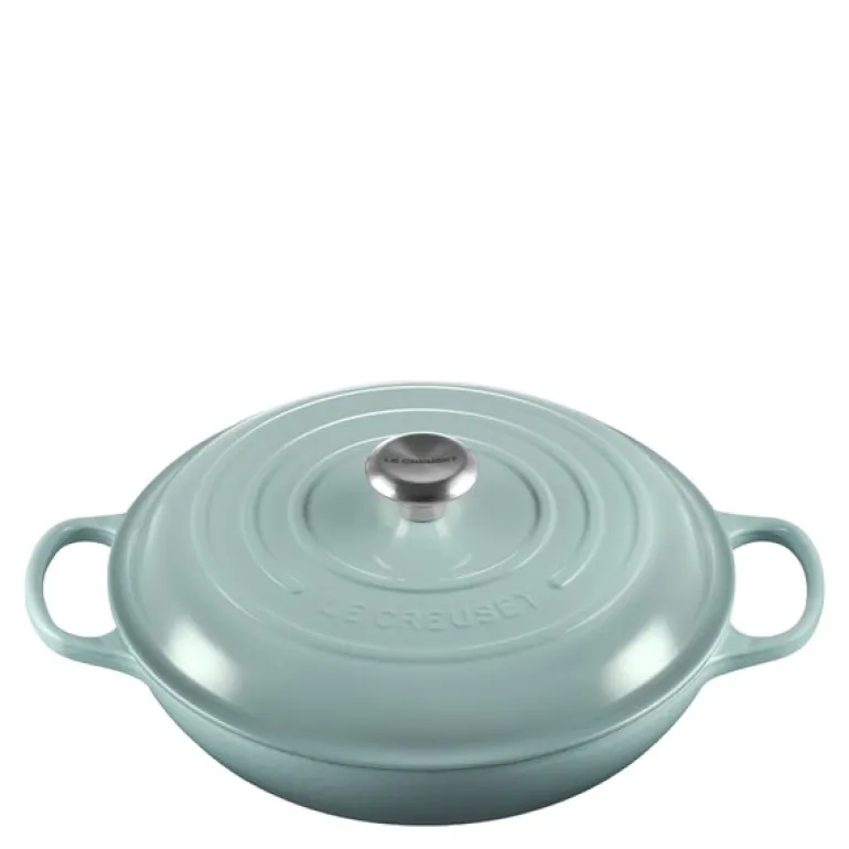 Signature buffetgryte i støpejern, 30 cm, 3,5L i fargen Sea Salt fra Le Creuset er en allsidig og elegant gryte som løfter matlagingen din til nye høyder. Med sitt brede, flate design og grunne sider er den ideell for alt fra kremet risotto til mørt kjøtt og sprø, gyldne paier. Buffetgryten gir deg uendelige muligheter, enten du vil småkoke gryteretter, steke grønnsaker eller bake smakfulle retter.