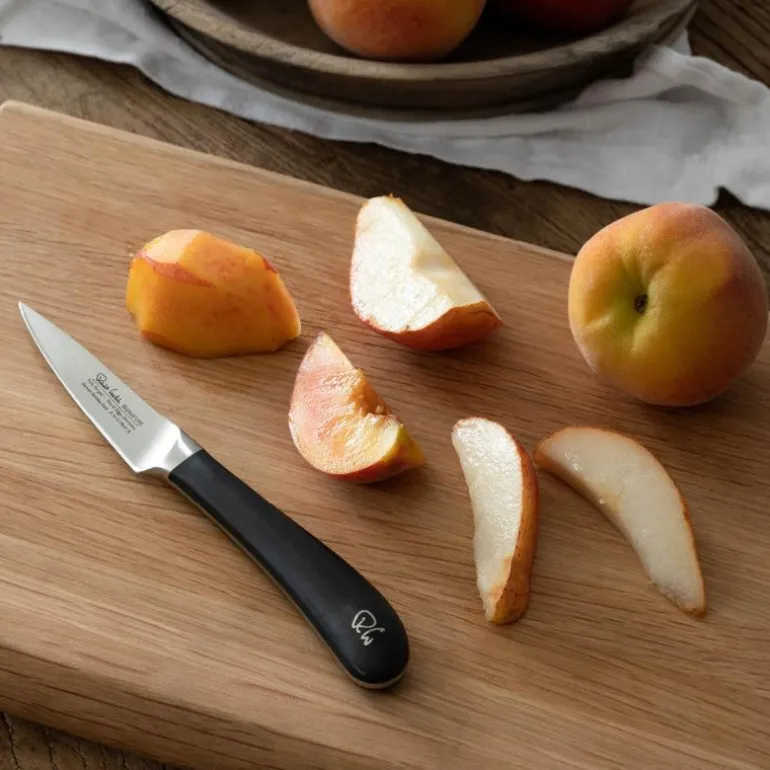 Robert Welch Signature grønnsakskniv 8cm gjør det enkelt å skrelle, hakke og skjære grønnsaker, frukt og andre ting med hard overflate eller hud. Grønnsakskniven er en hybrid av europeisk og asiatisk banebrytende teknologi. Kniven er helsmidd med tysk DIN 1.4116 rustfritt stål og med fylt kjerne for ekstra styrke. Grønnsakskniven er designet ved hjelp av World Edge Geometry™, for å få barberbladsskarphet med en 15-graders kantvinkel og med et ergonomisk DuPont™-håndtak som føles som om det var skreddersydd for hånd.Alle Robert Welch Signature-produkter leveres i stilig gaveemballasje, kan maskinvaskes og har 25 års garanti.