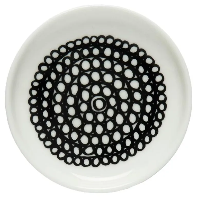 Denne lille tallerkenen er dekorert med det svart-hvite Siirtolapuutarha-mønsteret. Den er laget av hvit steintøy som tåler oppvaskmaskin, ovn, mikrobølgeovn og fryser.