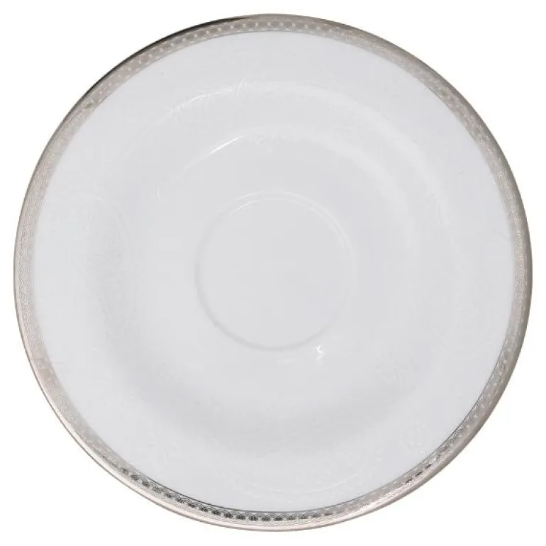 Skål til kaffekopp 15 cm i serviset Silver Paisley fra Royal Porcelain. Klassisk og tidløs, elegant og romantisk. Silver Paisley-serien fra Royal Porcelain kombinerer maskuline, stramme linjer med et delikat, romantisk mønster. Et design som gjør Silver Paisley like anvendelig som det er vakkert. Silver Paisley er festserviset du aldri blir lei av å ta frem, og er en serie du kan samle på hele livet. Hvorfor ikke sette dette serviset på ønskelisten til bryllupet?Serien er produsert av Royal Porcelain, en av Norges største merkevarer innen serviser. Silver Paisley er laget av benporselen, som er den aller fineste type porselen. Serien tåler oppvaskmaskin, men som med alle serviser med sølv eller gullkant bør serviset ikke vaskes med temperatur over 50 grader og det bør brukes halv dose med vaskemiddel. Fås kun hos Tilbords. Silver Paisley er et komplett festservise som inneholder alt du trenger til de ekstra spesielle anledningene. Det rene, tidløse designet gjør at serviset er like aktuell til alle årstider og kan kombineres med bordpynt i dine favorittfarger. Serien inneholder tallerkener i ulike størrelser – til forrett, hovedrett og dessert – serveringsfat i flere størrelser, suppeterrin, sausenebb og salatbolle. I tillegg finner du selvsagt et komplett kaffeservise.