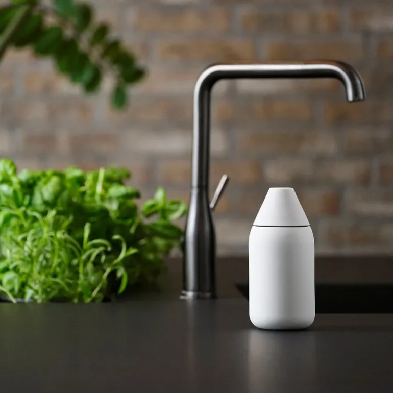 Singles såpebeholder warm grey fra Zone kombinerer funksjonalitet og elegant design på en imponerende måte. Den unike, rakettformede formen gir et moderne uttrykk som skiller seg ut på vasken, samtidig som den brede, sylindriske basen sørger for at dispenseren står stabilt. Med et lett trykk doserer du enkelt riktig mengde såpe fra åpningen på toppen, og når det er behov for påfyll, kan lokket skrus av med et enkelt håndgrep.