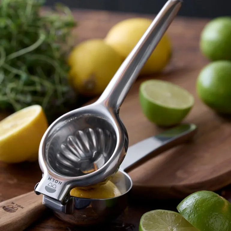 HOLM sitruspresse i rustfritt stål er 21,5 cm lang og har en innvendig diameter på 6 cm. Den er utviklet for enkel og effektiv pressing av lime, sitroner og små appelsiner. Saften presses ut uten at frø og fruktkjøtt følger med, og du unngår søl under tilberedning.