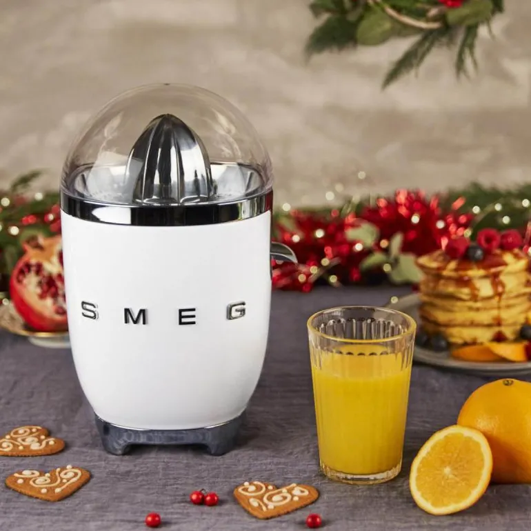 Sitruspresse fra Smeg i 50`s Retro Style i fargen hvit. Sitruspresse i formpresset aluminium. Automatisk på og avstenging. Lokk og kanne i Tritan™. Anti-drop tut/munnstykke i rustfritt stål. Presskjegle i rustfritt stål. Innebygget ledningsoppbevaring. Gummibein for stabilitet. Effekt: 70 W.Smeg er en italiensk produsent av husholdningsapparater som holder til i Guastalla, ved Reggio Emilia nord i landet. Smeg har datterselskaper over hele verden (i Storbritannia, Frankrike, Belgia, Nederland, Tyskland, Sverige, Danmark, Spania, Portugal, Russland, Ukraina, Kasakhstan, Sør-Afrika, USA, Australia og Mosambik), utenlandske kontorer i Hong Kong og Saudi-Arabia samt et omfattende forhandlernettverk.