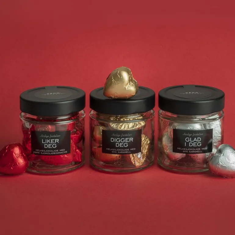 Sjokoladehjerter i rød, gull og sølv med navnene Liker deg, Digger deg og Glad i deg. Røde sjokoladehjerter med melkesjokoladeog mørk sjokoladeganache. Gull sjokoladehjerter med melkesjokolade og myk karamell. Sølv sjokoladehjerter med melkesjokolade og myk karamell.
