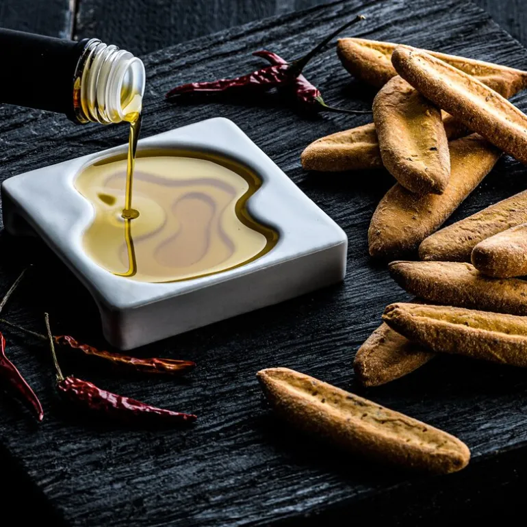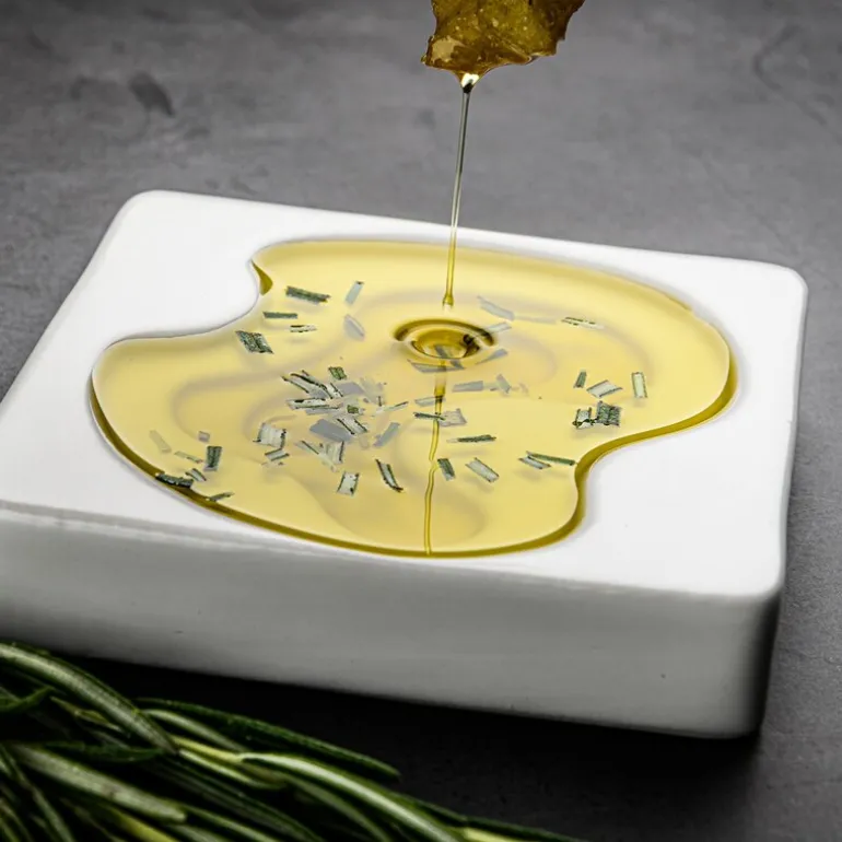 To små skåler med stor visuell effekt – Style De Vie presenterer et sett med 12 cm olivenoljeskåler med abstrakt mønster. Designet fremhever oljens fargenyanser gjennom skålens nivåinndeling, og gjør hver servering til en opplevelse.