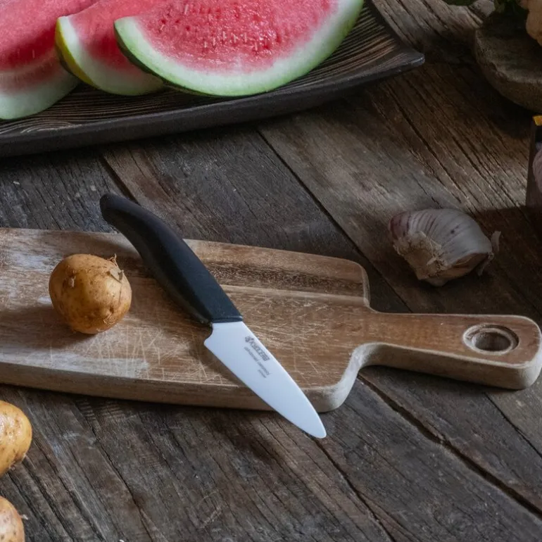 Keramisk skrellekniv med hvitt blad og svart håndtak. Kyoceras minste kniv – en japansk vinner som passer for de kresne på kjøkkenet. Kniven har et blad laget av presset keramikk – verdens hardeste materiale etter diamant. Kniven holder seg sylskarp lenge – men du kan enkelt slipe den med en diamantkant ved behov. Kniven er lett, ruster ikke og er ikke påvirket av syrer. I tillegg kan du maskinvaske den. En keramisk skrellekniv kan brukes til det meste, men unngå harde skalldyr, bein og frosne råvarer.