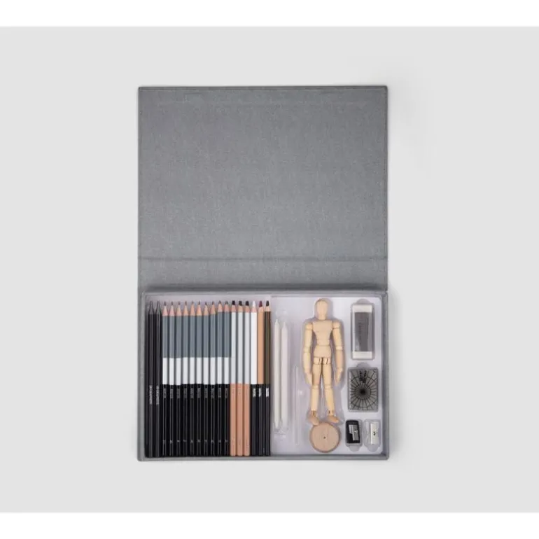 Dette vakre settet tar artistambisjonene dine til neste nivå. Tredukken er nyttig for å tegne menneskelig anatomi og for å balansere proporsjoner og former. Produktinnhold: – 1 utstillingsdukke i tre med podium – 2 spissere – 2 viskelær – 3 pastellpenner – 3 karbonpenner – 2 grafittpenner – 10 skissepenner