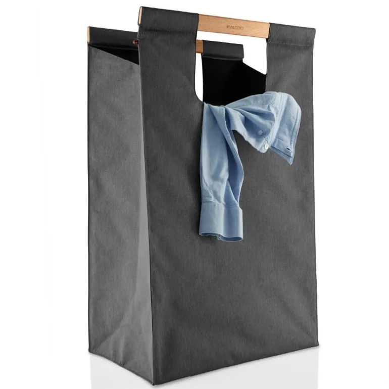 Dekorativ skittentøyspose i mørk grå nylon, fra Eva Solo. Skjul skittentøyet på et blunk med en funksjonell skittentøykurv, oppbevaring og transportveske i ett. Den dekorative skittentøyposen i delikat grå farge har et praktisk bærehåndtak i bøk som gjør posen enkel å ta med til for eksempel vaskekjelleren. Den lukkes med magnet, og står stabilt uten å falle sammen.