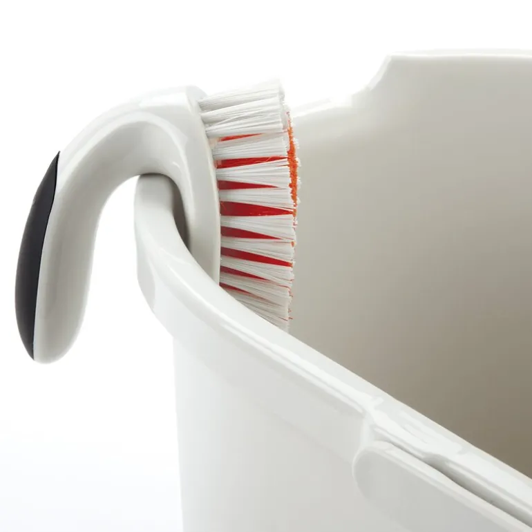 Det ergonomiske håndtaket er utformet for komfort og holder knokene unna, med et sklisikkert belegg som sikrer godt grep, selv når hendene er våte. Børsten kan enkelt henges på kanten av bøtta for tørking etter bruk.