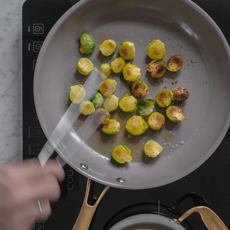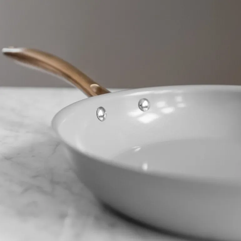 Sky stekepanne 28 cm fra Modern House kombinerer funksjonelt design med estetisk uttrykk. Pannen er laget i 18/0 stål og har en dempet lattefarge og håndtak i børstet gull. Den 3-lags konstruksjonen med aluminiumskjerne gir rask oppvarming og jevn varmefordeling, som gjør matlagingen effektiv og energibesparende.