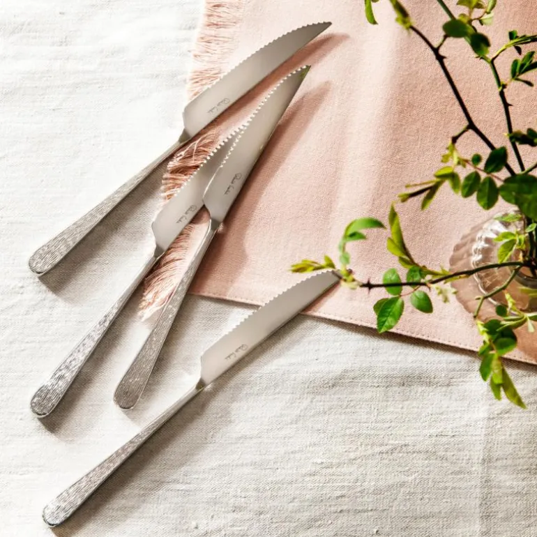 Håndtaket har en subtil tekstur inspirert av tradisjonelle sølvsmedteknikker, som gradvis tones ut mot bladet og gir et mykt, komfortabelt grep. Knivens form og balanse gjør den ideell for å skjære gjennom kjøtt med presisjon og stil.