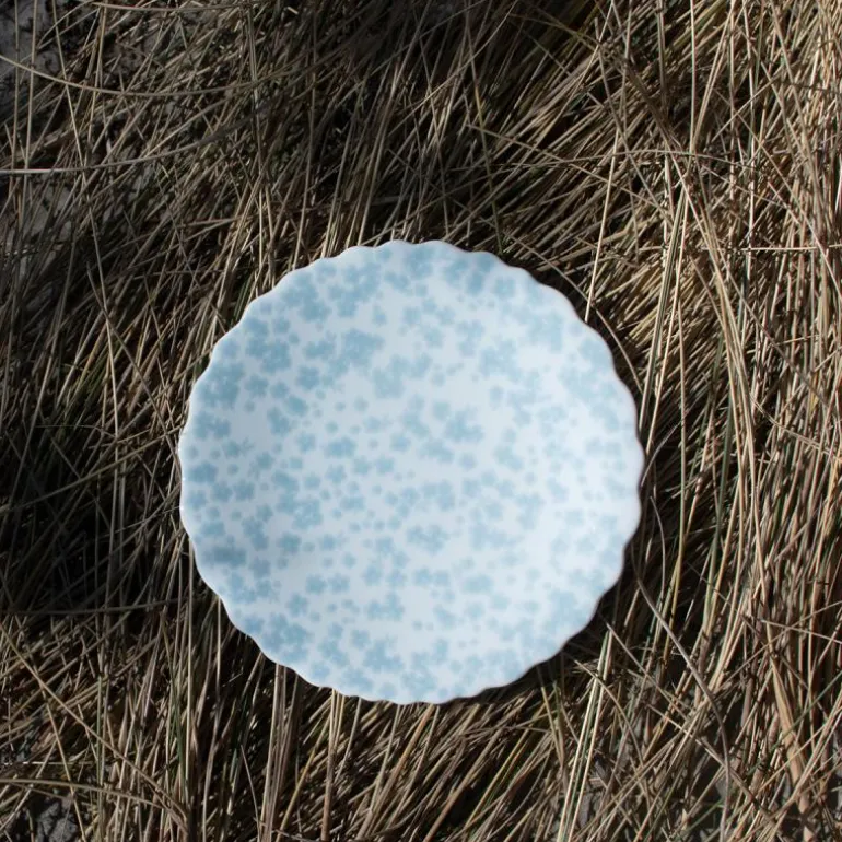 Slåpeblom blå asjett 21 cm fra Wik & Walsøe i edelt benporselen av høy kvalitet kjennetegnes ved den ujevne og bølgete kanten som fremhever følelsen av håndverk. Med asjetten i hendene kan man kjenne det taktile mønsteret som preger designet.