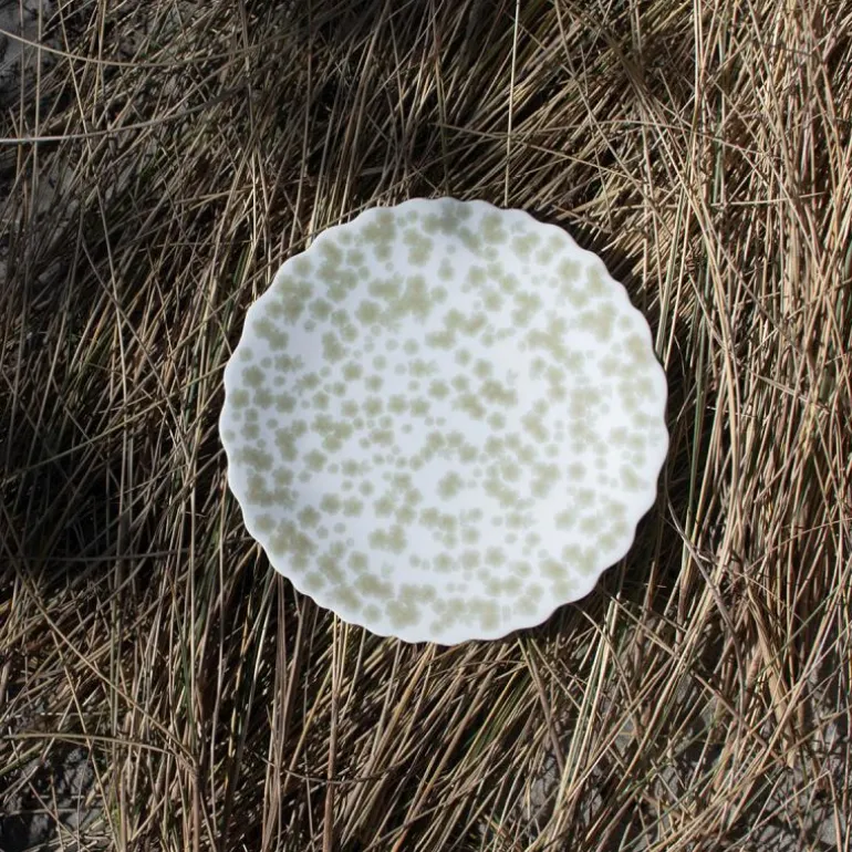 Slåpeblom grønn asjett 21 cm i benporselen, fra Wik & Walsøe. I naturen, når sollyset faller på slåpeblomstens kronblader, endrer nyansene seg fra det helt mørke i skyggen, til det helt lyse der solen skinner som sterkest. Slik er det også med kolleksjonen Slåpeblom.