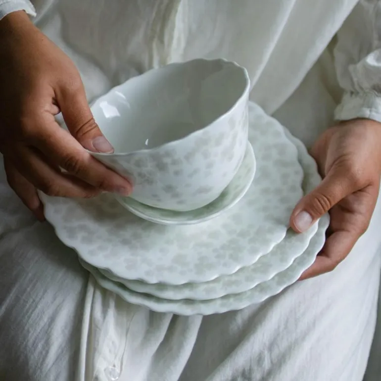 Benporselenet er lett gjennomgskinnelig og sart, men svært slitesterkt. Den er håndlaget, tåler oppvaskmaskin, mikrobølgeovn, stekeovn og hverdagslig bruk. Kolleksjonen kommer i varm grå, rosa, blå og grønn og det vil være variasjoner i fargenyansene. Dette gjør hver enkelt produkt unikt.