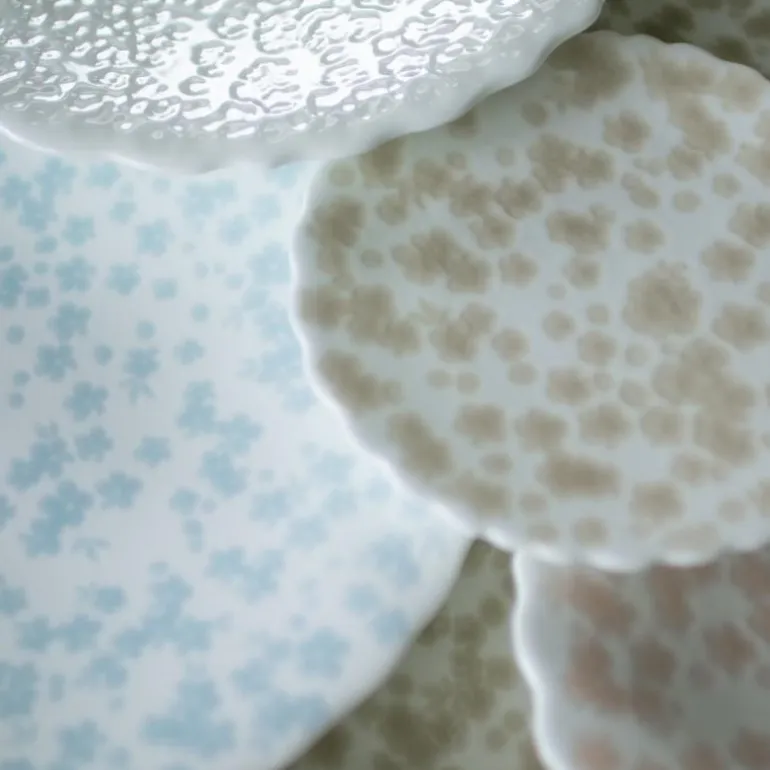 Slåpeblom blå miniasjett 13 cm fra Wik & Walsøe i benporselen av høy kvalitet kjennetegnes ved den ujevne og bølgete kanten som fremhever følelsen av håndverk. Med asjetten i hendene kan man kjenne det taktile mønsteret som preger designet.