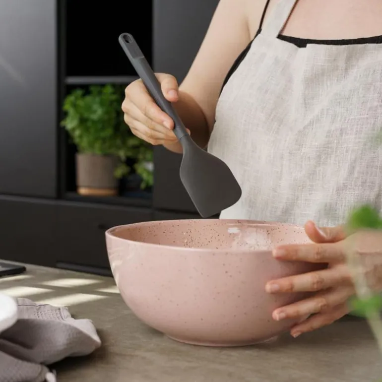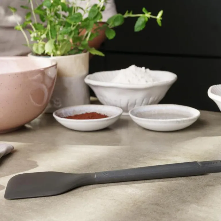 Grå slikkepott 31 cm fra Zyliss. Slikkepotten har en vinklet spiss med myke silikonkanter for å nå hvert hjørne av kokekaret, slik at ingen mat blir liggende igjen. Takket være silikonhodet er den også egnet for panner som ikke kleber.