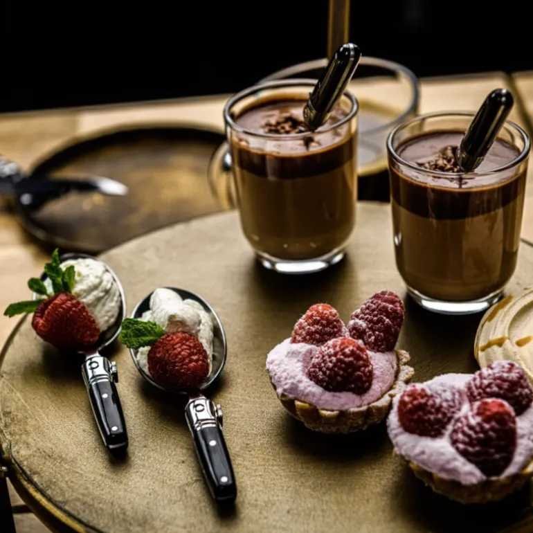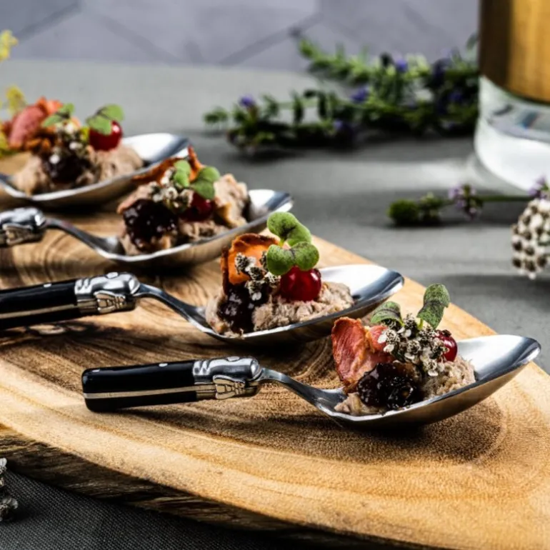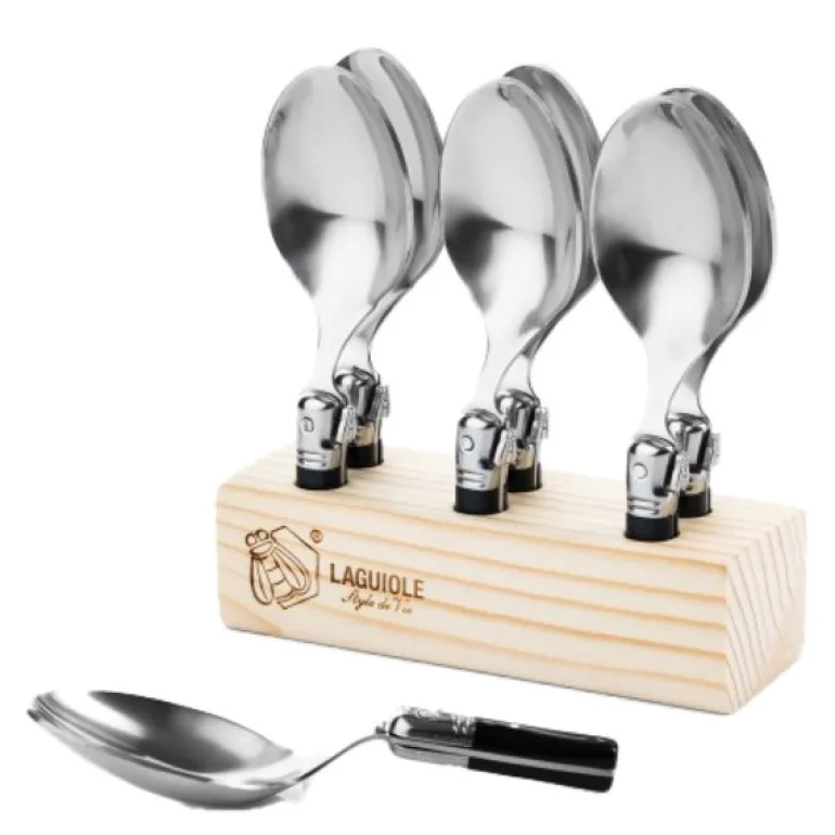 Laguiole Style de Vie smaksskjeer er laget for servering av appetittvekkere og små munnfuller før eller mellom retter. Settet inneholder seks skjeer i rustfritt stål, pent arrangert i et treblokk som gjør dem lett tilgjengelige og dekorative på bordet.