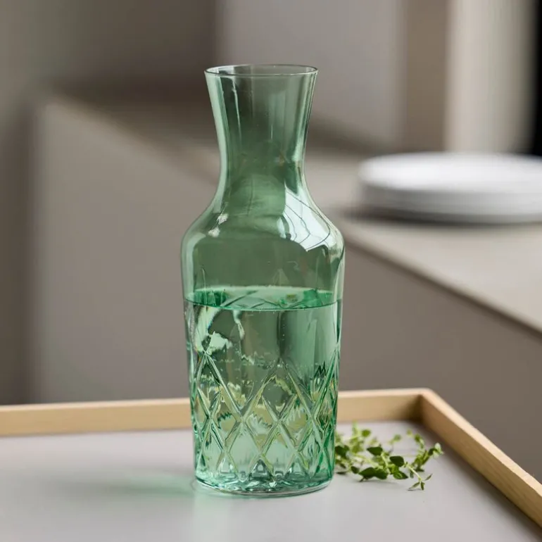 Sorrento vannkaraffel med kapasitet på 1L i grønnfarget glass fra Lyngby Glas kombinerer funksjonalitet med elegant design. Med sitt fasetterte fargede glass skaper karaffelen et vakkert lysspill som fremhever innholdet og tilfører bordet et sofistikert preg.