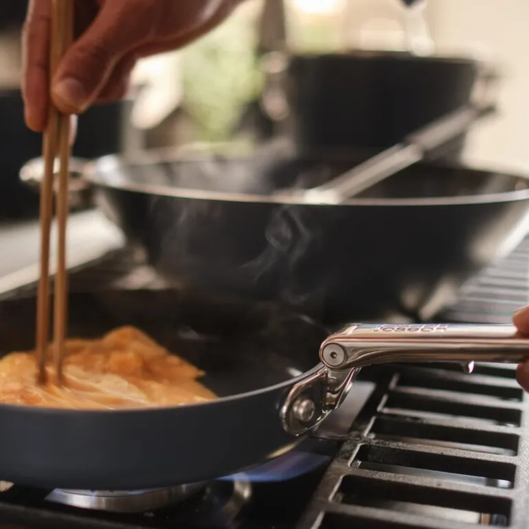 Stekepannene er laget av solid aluminium som sikrer jevn varmefordeling og gir deg perfekte matlagingsresultater hver gang. Pannene er kompatible med alle komfyrtyper, inkludert induksjon, og leveres med en praktisk filtbeskytter for å unngå riper når de stables.
