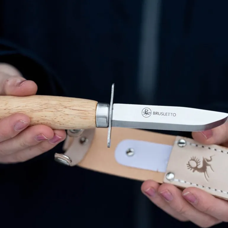 Speiderkniv med butt tupp fra Brusletto er perfekt for de yngste eventyrerne. Med et sikkert design, fingerbeskytter og avrundet tupp gir den trygghet for både barn og foreldre. Skaftet i lakkert tre er tilpasset små og større hender, og knivbladet i 3Cr13 stål er lett å slipe. Dette er den nyeste utgaven av Bruslettos klassiske speiderkniv fra 1950 – nå tilpasset yngre brukere. En trygg start på friluftslivets mange opplevelser, med kvalitet du kan stole på.
