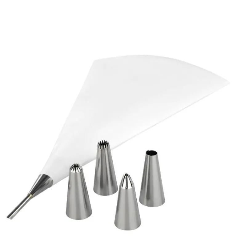 Praktisk sprøyteposesett fra Tala, med sprøytepose laget av spesialstoff 26 cm, og 4 store rustfrie dekorasjonsdyser ca 5,5 cm, samt en rustfri påfyllingsdyse ca 10 cm.