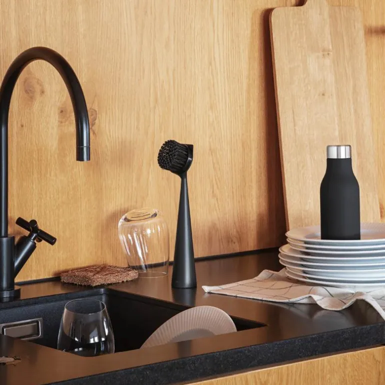 Med Squeeze såpedispenser svart fra Eva Solo får du en praktisk og dekorativ løsning for oppvaskmiddelet. Dispenseren er laget i elegant, matt silikon som føles myk i hånden og gir et moderne preg til kjøkkenet.