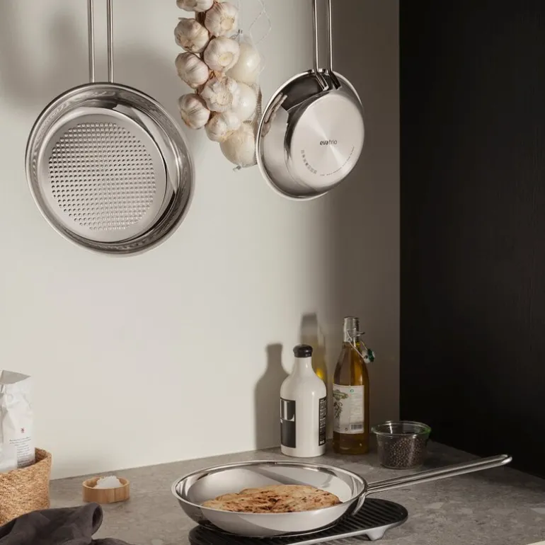 Stainless Steel stekepanne 28 cm honeycomb fra Eva Trio. Stekepannen er utstyrt med en unik «vaffel»-bunn som effektivt reduserer matens tendens til å feste eller brenne seg. Det smarte mønsteret fordeler fettet og forbedrer pannens naturlige sklievne.
