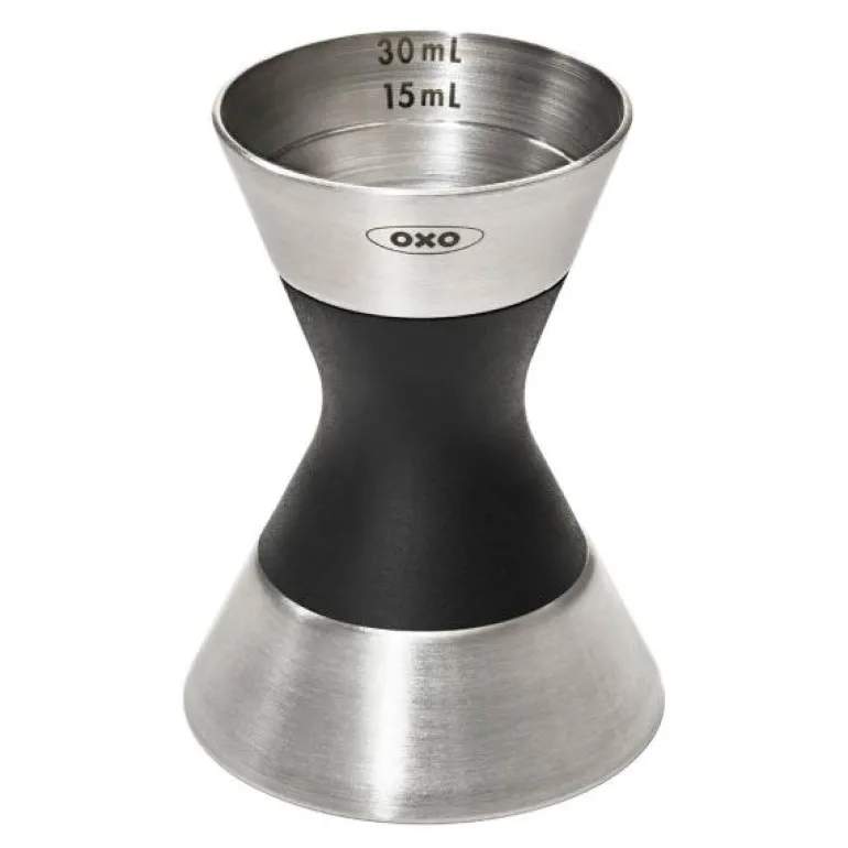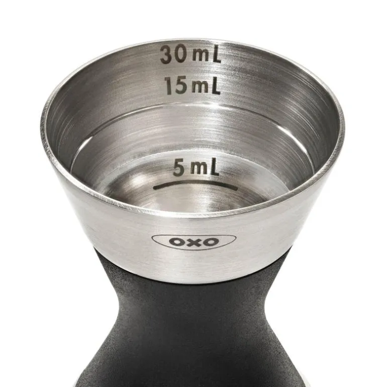 Det dobbelte målebegeret er både praktisk og elegant i børstet rustfrit stål med et non-slip grep i midten. Den ene siden måler 5, 15 og 30 ml. Den andre siden måler 10, 20 og 50 ml.