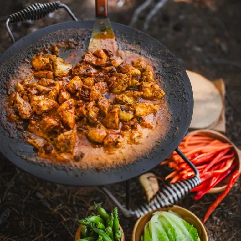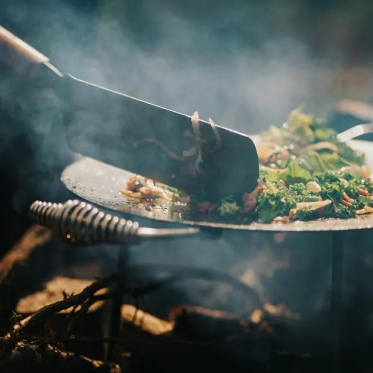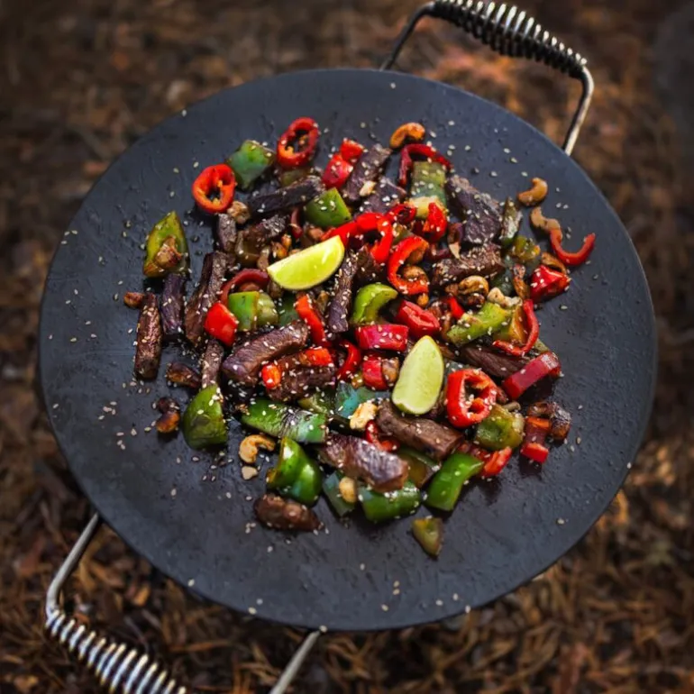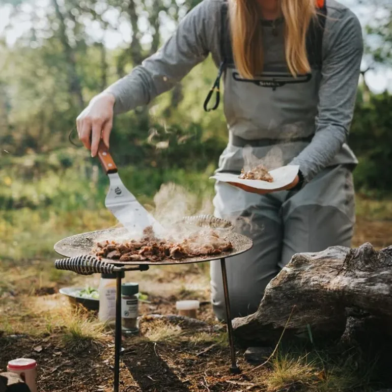 De forkrommede fjærstålhåndtakene holder seg kjøligere for komfortabel håndtering og er inspirert av robuste vedkomfyrer. En slitesterk produkt med livstidsgaranti på stekhellen, laget for å bli med på eventyr år etter år.