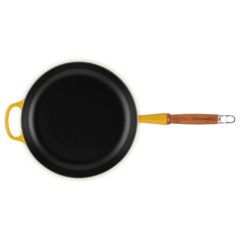 Le Creusets stekepanne 28cm i støpejern med trehåndtak har et utall av anvendelsesmuligheter, blant annet steking av biffer og grønnsaker. Trehåndtaket blir ikke varmt ved matlaging, og pannen er derfor grei å håndtere uten bruk av grytekluter. Støpejernspannen fås i et bredt utvalg av Le Creusets velkjente farger, slik at den matcher resten av samlingen og/eller kjøkkenet.