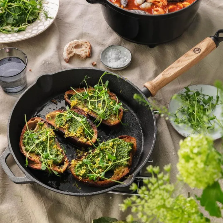 Stenfors stekepanne 28 cm i støpejern er en allsidig panne som gir jevn og rask varmefordeling, noe som sikrer en perfekt stekeoverflate. Pannen har et elegant trehåndtak i eik og et ekstra håndtak for enkel håndtering. Med praktiske helletuter på begge sider er den ideell for å helle av overflødig væske. For best resultat anbefales det alltid å bruke matfett. Denne solide støpejernspannen vil raskt bli en favoritt på kjøkkenet.