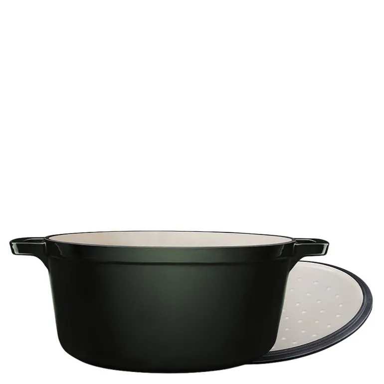 Stenfors støpejernsgryte rund 4,4L i grønn er en robust og funksjonell gryte som passer for både små og store husholdninger. Laget av emaljert støpejern, gir gryten jevn varmefordeling som holder på varmen helt til kantene, noe som sikrer optimale resultater ved matlaging. Emaljen absorberer verken smak eller lukt, og den er enkel å rengjøre etter bruk. Lokket har en knott som gjør at kondensen drypper tilbake i gryten, i stedet for å samle seg langs kantene, noe som forbedrer smaken og konsistensen på maten.