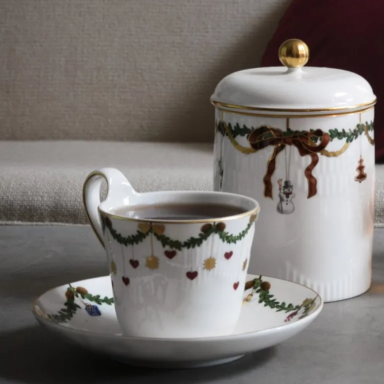 Stjerne Riflet Jul tallerken på 16 cm fra Royal Copenhagen er et sjarmerende innslag på julebordet, perfekt for å skape en høytidelig og tradisjonsrik atmosfære. Med sine detaljerte kranser av gran og røde silkebånd har denne tallerkenen blitt en klassiker, elsket av juleentusiaster verden over. Designet i benporselen og håndmalt i farger som hvit, gull, grønn og rød, kombinerer tallerkenen eleganse og tidløs sjarm, inspirert av et opprinnelig design fra 1895.