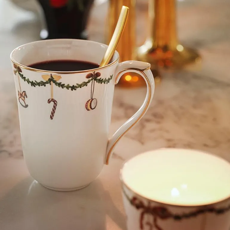 Stjerne Riflet Jul kopp 36 cl i 2-pakning fra Royal Copenhagen gir en tradisjonsrik eleganse til alle julens kaffestunder. Dekorert med vakre kranser og røde bånd, har Stjerne Riflet Jul blitt en klassiker blant Royal Copenhagens julekolleksjoner. Inspirasjonen bak designet stammer fra en serie som første gang ble produsert i 1895, og dette serviset er nå elsket på juledekkede bord verden over. Hver kopp i benporselen er håndmalt i delikate nyanser av hvitt, gull, grønt og rødt, noe som gir dem en tidløs og sofistikert julefølelse.