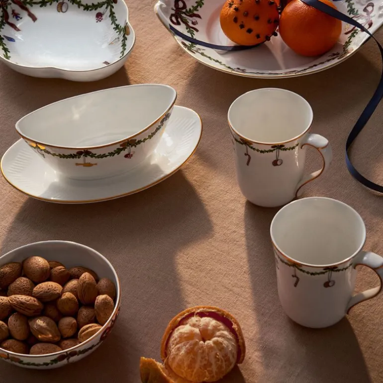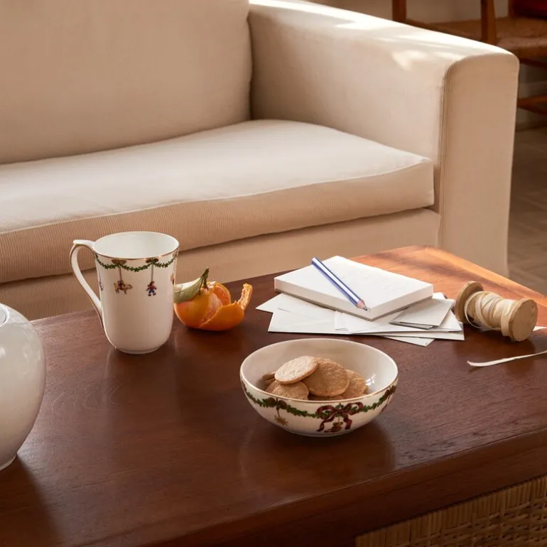 Med et volum på 36 cl og en høyde på 11 cm, er disse koppene ideelle til en rikelig kopp kaffe eller te. Star Fluted Christmas-kolleksjonen kombinerer Royal Copenhagens lange håndverkstradisjon med juleinspirerte detaljer, og de gylne kantene tilfører en ekstra festlig glød. Tåler oppvaskmaskin, slik at serviset enkelt kan brukes daglig gjennom hele høytiden – perfekt for de mange samlingene rundt bordet som hører julen til.